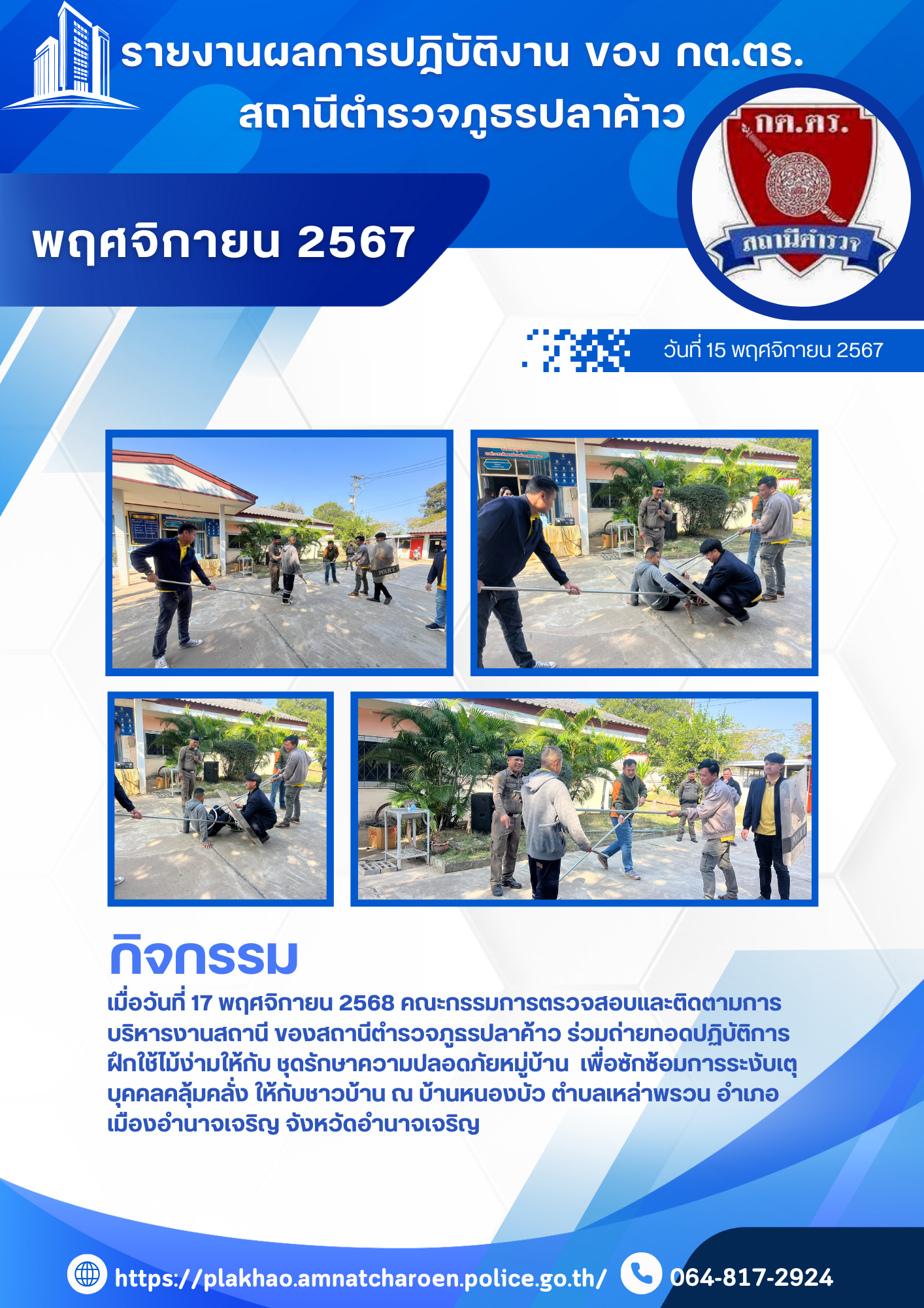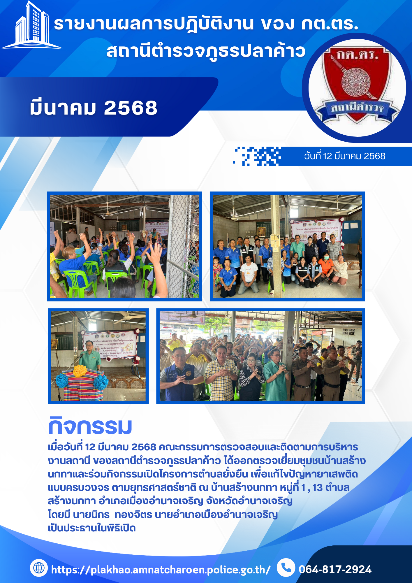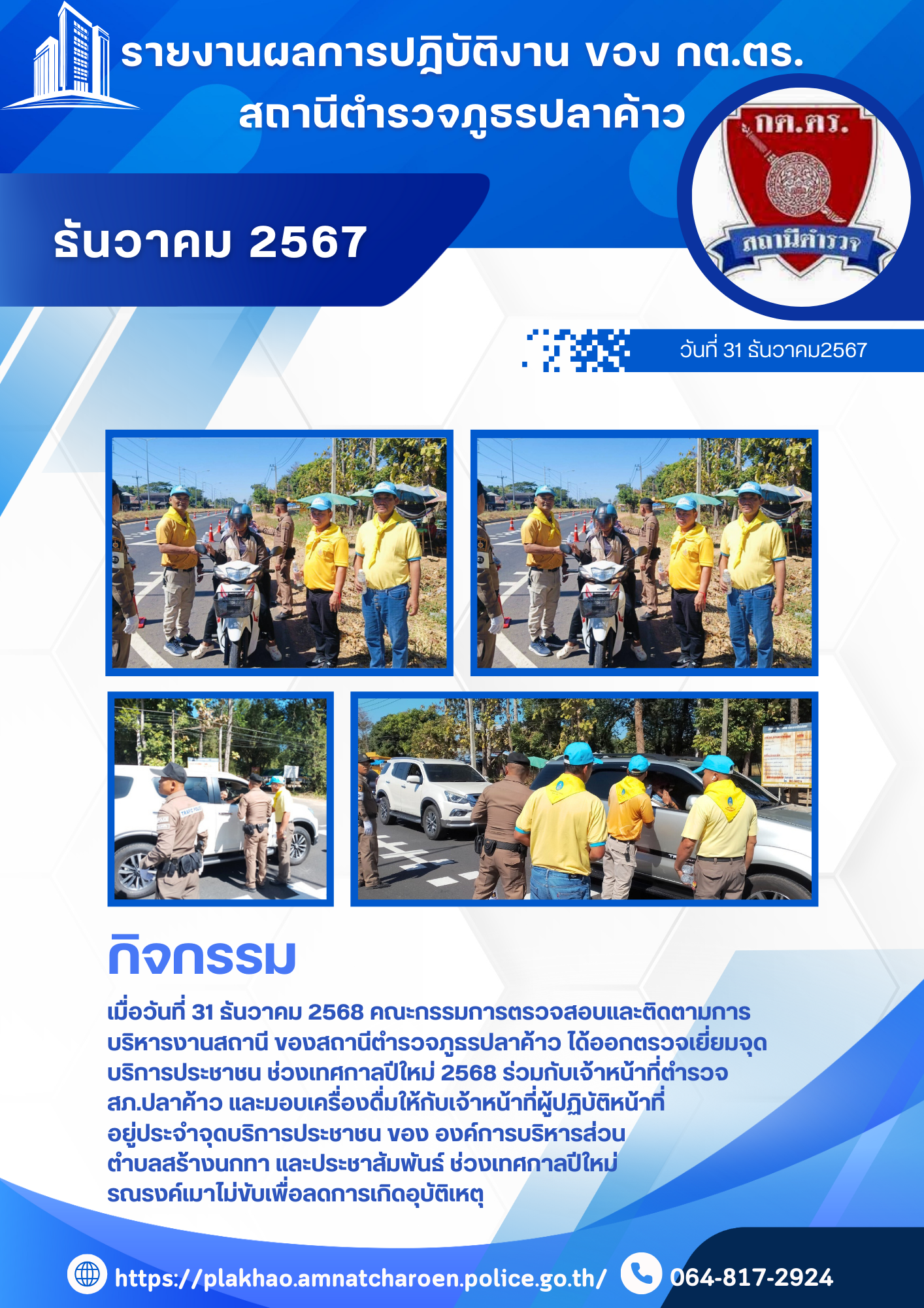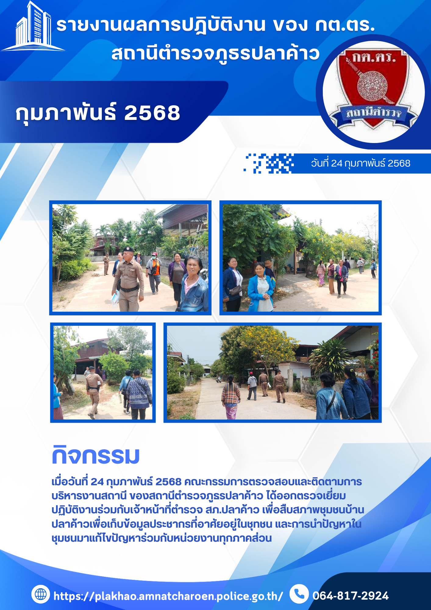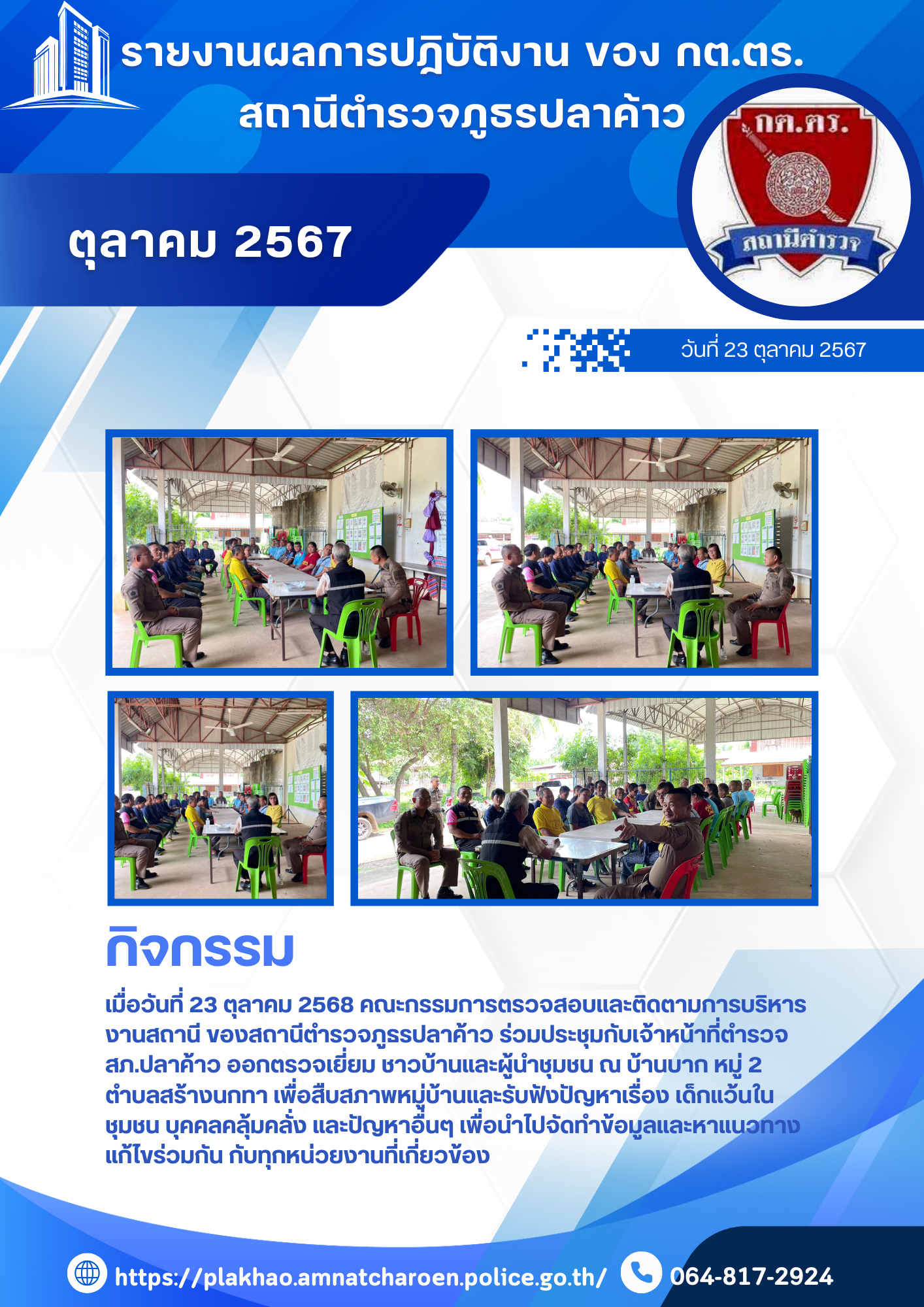 O4 ข้อมูลคณะกรรมการตรวจสอบและติดตามการบริหารงานตำรวจ (กต.ตร.) ของสถานีตำรวจ คณะกรรมการตรวจสอบและติดตามการบริหารงานตำรวจ สถานีตำรวจภูธรปลาค้าว (กต.ตร.สภ.ปลาค้าว) คำสั่งคณะกรรมการ กต.ตร.สภ.ปลาค้าว เอกสารอ้างอิงระเบียบ 9.ระเบียบ ก.ต.ช. ว่าด้วย กต.ตร. พ.ศ.2549 (ฉบับแก้ไขปรับปรุง) เอกสารอ้างอิง : วิธีการสรรหาคณะกรรมการตรวจสอบและติดตามการบริหารงานตำรวจสถานีตำรวจภูธร (กต.ตร.สภ.) คณะกรรมการตรวจสอบและติดตามการบริหารงานตำรวจสถานีตำรวจภูธร (กต.ตร.สภ.) จำแนกตามกลุ่มและการได้มาของกรรมการ ดังนี้ วิธีการสรรหาคณะกรรมการตรวจสอบและติดตามการบริหารงานตำรวจสถานีตำรวจภูธร (กต.ตร.สภ.) จำแนกตามกลุ่มและการได้มาของกรรมการ ดังนี้ ที่มา : คู่มือการดำเนินการตามระเบียบ ก.ต.ช.ว่าด้วยคณะกรรมการตรวจสอบและติดตามการบริหารงานตำรวจ พ.ศ. 2546จาก https://www.boardofroyalthaipolice.go.th/th/pages/10256-%E0%B8%84%E0%B8%B9% คลิ๊กดู ผลการดำเนินงาน ตุลาคม 2567 คลิ๊กดู ผลการดำเนินงาน พฤศจิกายน 2567 คลิ๊กดู ผลการดำเนินงาน ธันวาคม 2567 คลิ๊กดู ผลการดำเนินงาน มกราคม 2568 คลิ๊กดู ผลการดำเนินงาน กุมภาพันธ์ 2568 คลิ๊กดู ผลการดำเนินงาน มีนาคม 2568 FacebookFacebookXXLINELine